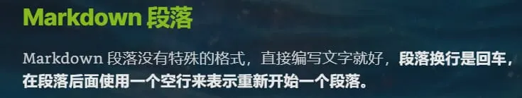 Markdown 段落没有特殊的格式,直接编写文字就好,段落换行是回车,在段落后面使用一个空行来表示重新开始一个段落。